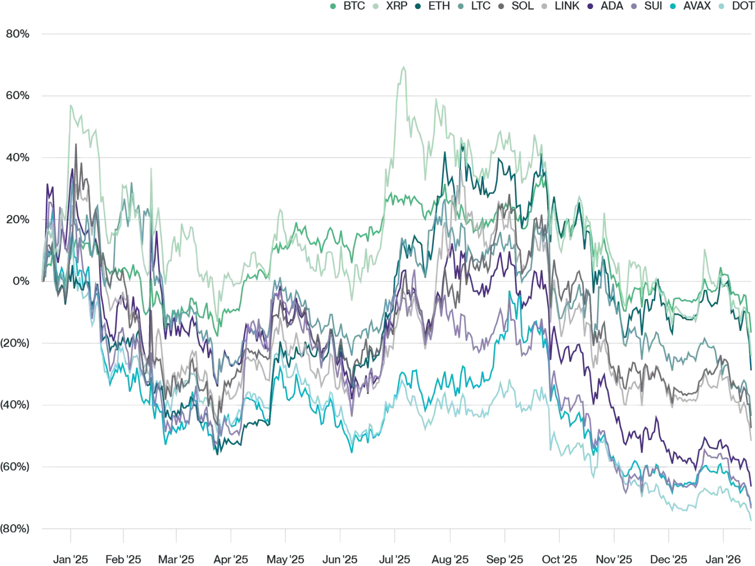 · 第二类资产(SOL、LTC、LINK)经历了标准熊市,下跌 36.9% 至 46.2%