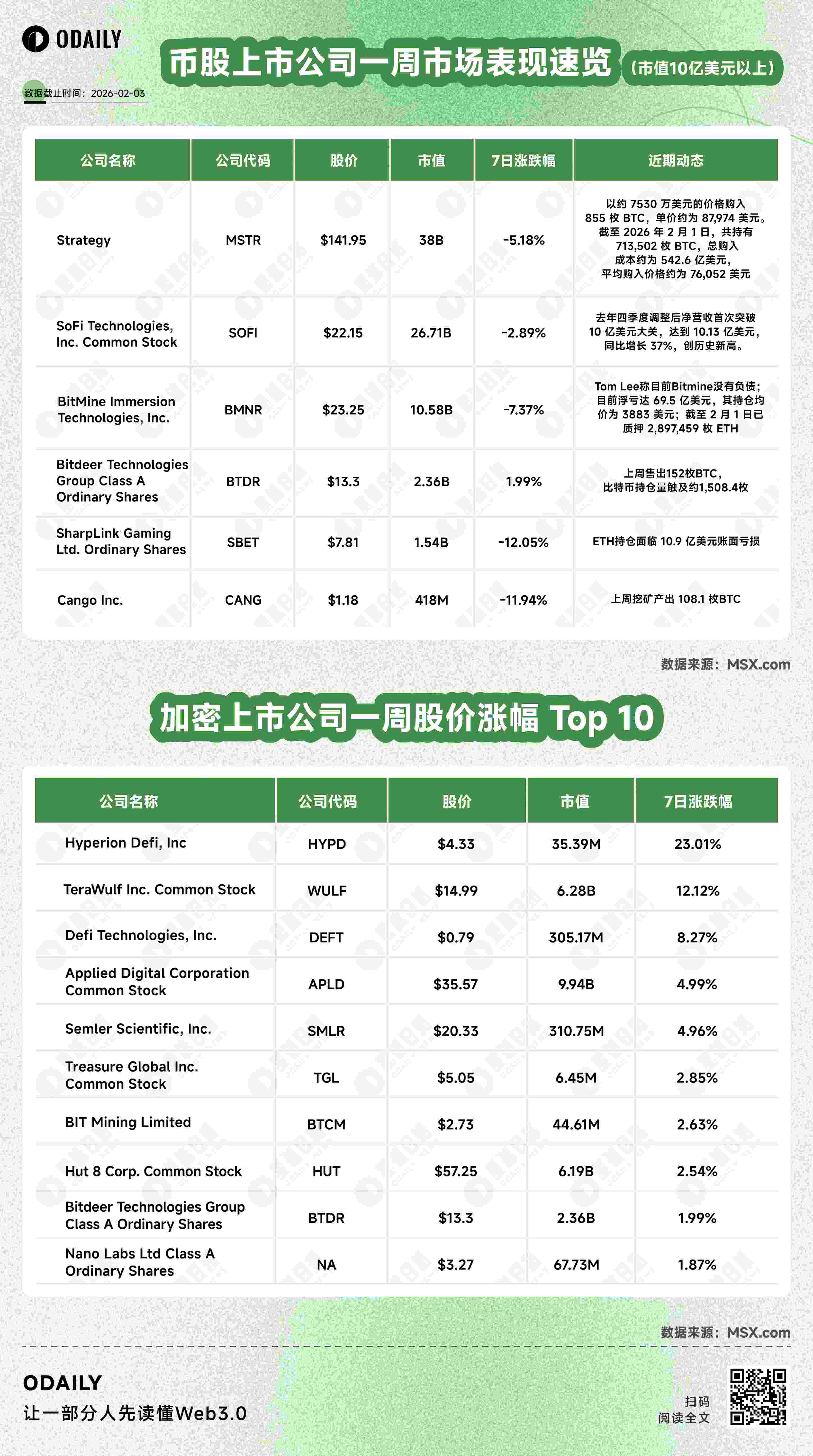 最后,得益于近期金银合约交易量持续上涨、测试原生预测市场等利好消息刺激,HYPE 价格大幅上涨,其 DAT 公司 Hyperion Defi, Inc 股价近 7 日涨幅高达 23%左右,领跑加密概念股涨幅榜。