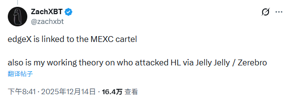 此外,链上侦探 ZachXBT 还发现,edgeX 与 MEXC 的做市地址存在链上关联,并推测与此前攻击 Hyperliquid 的 Jelly Jelly、Zerebro 事件有关,当时曾导致其单日 TVL 损失约 2 亿美元。与此同时,MEXC 官方博客持续为 edgeX 做推广,并上线盘前交易,两者关系显然已经超出普通合作范畴。