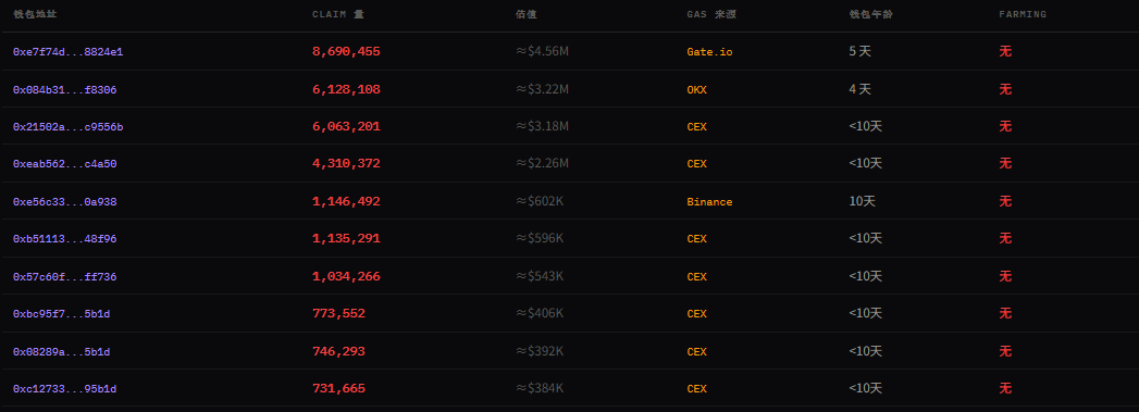 “老鼠仓”被实锤,多地址符合“4 至 10天内创建 + CEX 热钱包直充 Gas + 巨额空投申领”