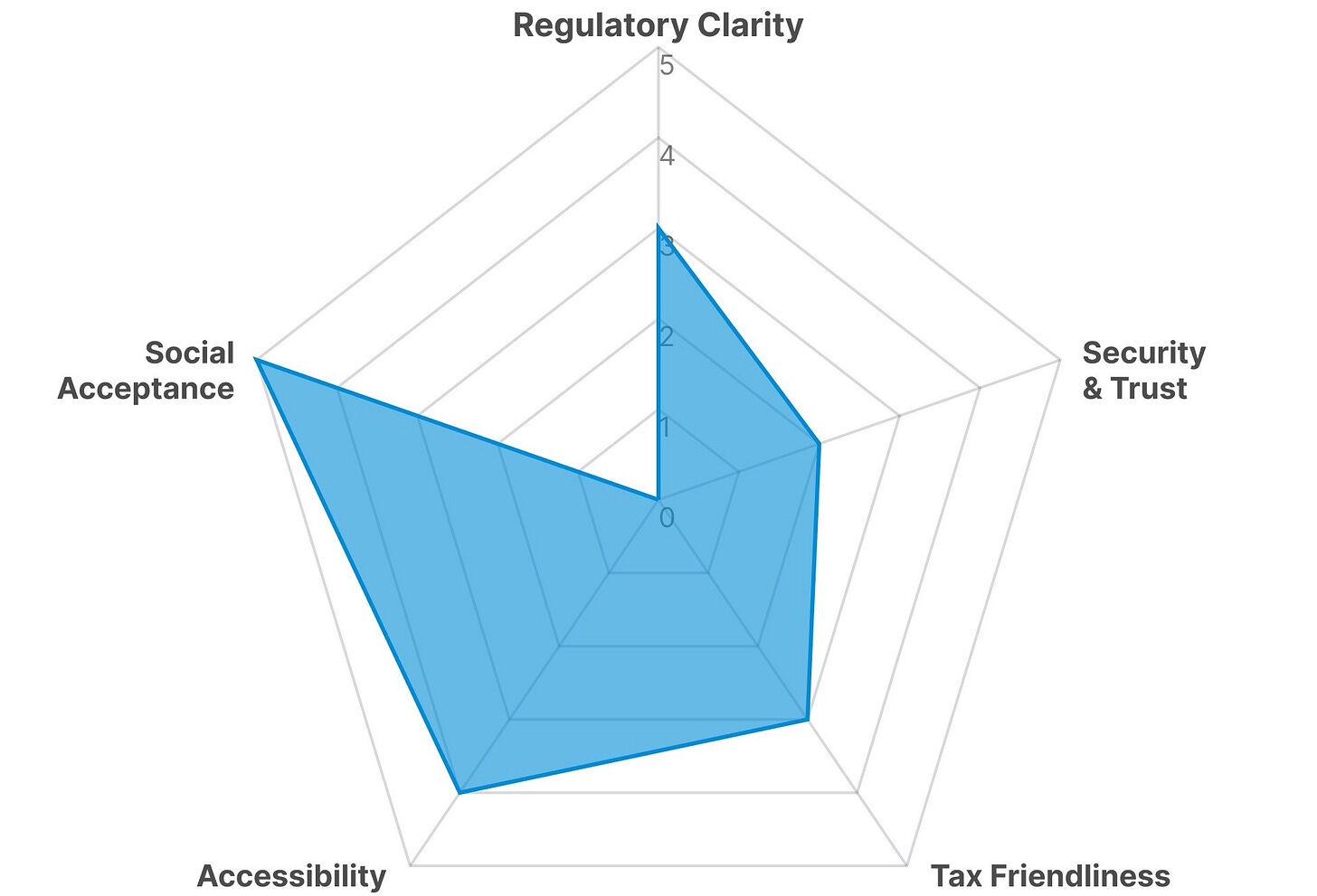 在报告涵盖的八个市场中,新加坡在所有五个障碍维度(监管、安全、税收、便利性和社会认知)上都表现最为均衡,没有哪个维度明显薄弱。