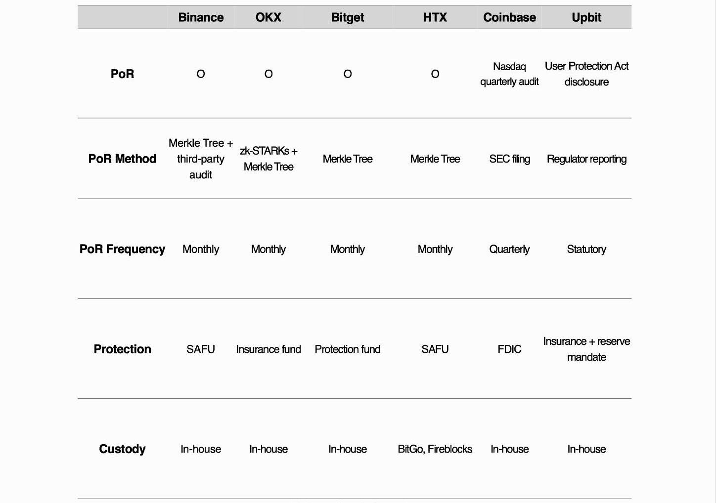 需要注意的是,表格中总结的 PoR、保护基金和安全框架仅反映了特定时间点的情况。即使交易量大幅下降,每月 PoR 披露是否持续以及保护基金是否保持完好也至关重要。