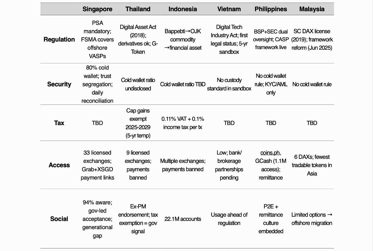 社会认可度已经足够,问题在于建立在其上的制度保护。菲律宾中央银行(BSP)自 2022 年 9 月起冻结了新的虚拟资产服务提供商(VASP)牌照发放。尽管冻结期延长至 2025 年 9 月,但目前仅有 9 家 VASP 存在。菲律宾证券交易委员会(SEC)于 2025 年 7 月实施了资本充足率监管框架(CASP),引入了最低资本、资产隔离和市场营销方面的规定,但该框架仍处于早期阶段。