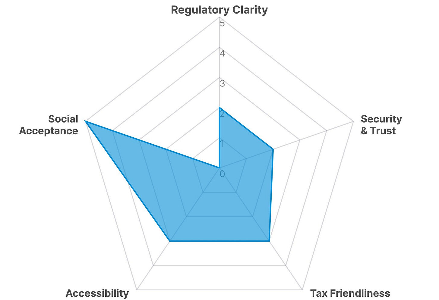 菲律宾的情况与越南类似,都表现出较高的社会接受度和较低的监管及安全水平,但性质有所不同。越南正在从零开始建立新的机构;而菲律宾却关闭了现有机构的大门。如果虚拟应用服务提供商(VASP)的禁令解除,且通用应用服务提供商(CASP)框架得以实施,那么就可以在现有的实际应用基础上建立起机构信任。