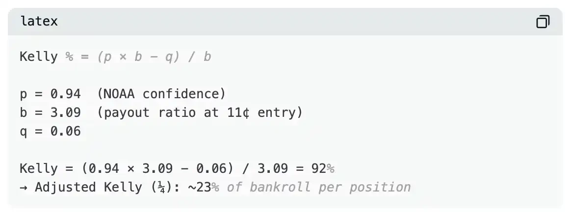 以 15 美分入场、NOAA 置信度高于 85%,意味着真实概率与市场定价之间至少存在 5.6 倍的错位。
