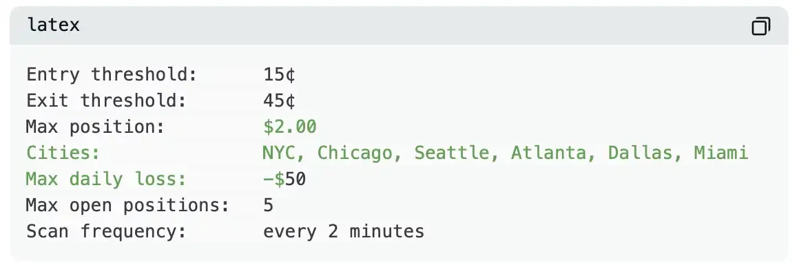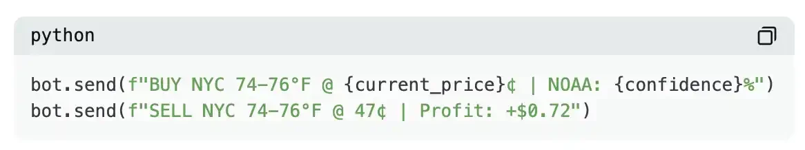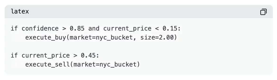 比如,NOAA 认为纽约周六落在 74–76°F 区间的概率是 94%,而 Polymarket 上这个区间的价格只有 11 美分。于是机器人在 11 美分买入。随着更多信息在接下来的几个小时内逐步被市场消化,价格上涨到 45–60 美分。机器人在 47 美分卖出。每股利润:+36 美分。