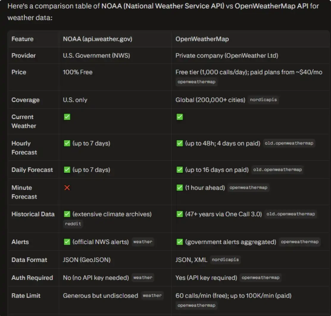 Perplexity 对比了 NOAA、OpenWeatherMap 和 AccuWeather,从准确率、成本、更新频率以及 API 可用性等多个维度进行了系统评估。