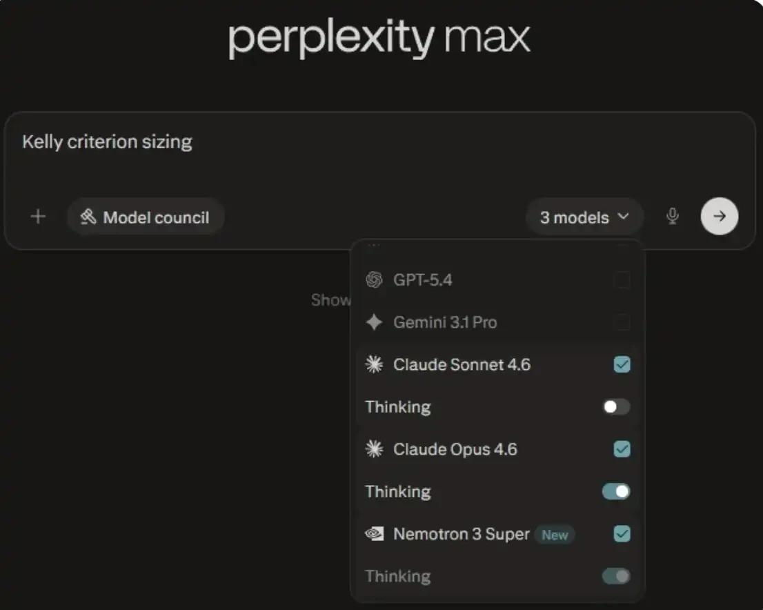 这也是为什么 Perplexity 的 model council 很重要。关于「最优仓位规模」的那个查询,并不是由单一模型处理的——而是同时交给 Claude、GPT 和 Gemini 并行运行。