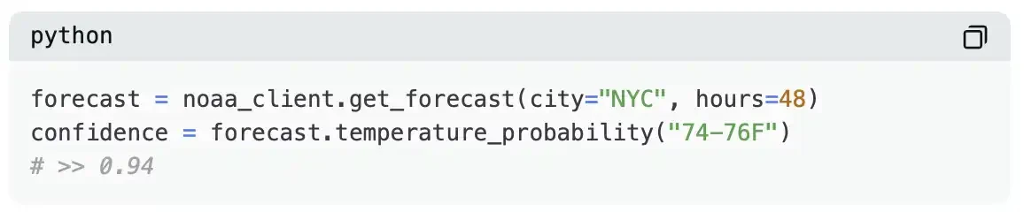 结果就是:NOAA 给出某个温度区间 94% 的概率置信度,市场却只给它定价 11 美分。