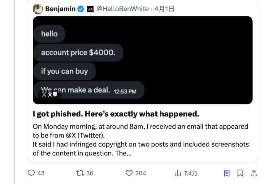 触发 Bier 此番表态的,是预测市场平台 Predictfully 创始人 Benjamin White 的一段亲身经历。据 TheStreet 报道,White 于 4 月 1 日在 X 平台详述了自己的账户如何被黑客攻破:攻击者伪装成版权侵权通知的钓鱼邮件诱骗他点击仿冒登录页面,窃取了包括双因素验证码在内的登录凭证,随后锁定其账户并利用该账户推广虚假加密项目。更过分的是,黑客甚至向他索要 4000 美元的「账户赎金」。