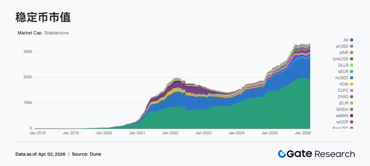 本周稳定币板块没有出现新的外部增量,整体高位盘整。USDT 与前一周几乎持平。USDC 回落约 14 亿美元,PYUSD 也下滑近 2 亿美元,这支付和结算导向的稳定币需求本周略有回落。相对更稳的是协议型稳定币,DAI 小幅增长,USDS 维持高位。USD1、USDe、GHO 有小幅波动,偏向结构性再配置。Circle 近期仍在推进 USDC + CCTP 的多链扩展,但本周数据反映是稳定币内部从支付结算向 DeFi 场景韧性倾斜。
