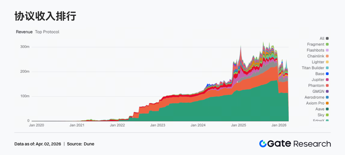 交易型协议的收入整体降温,稳定币发行方仍然是最稳的盈利中心。Tether 和 Circle 当周收入依然处于高位稳定区间。相比之下,Hyperliquid 从 1,430.25 万美元回落至 1,262.77 万美元,Pump 从 714.52 万美元降至 669.05 万美元,EdgeX 也从 455.34 万美元回落到 379.69 万美元,交易活跃度的冷却已经传导到收入端。整体来看,本周协议收入的主线是谁的收入更不依赖短期交易波动。