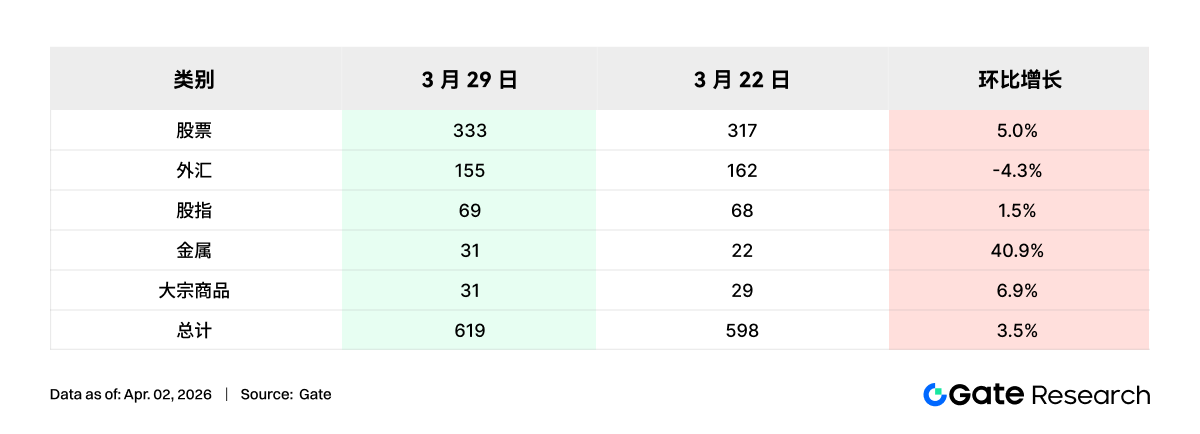 近一周 TradFi 资产类别数量进一步扩张,三家主流 CEX 在 TradFi 资产类别(仅统计 TradFi 与 CFD 板块,不含永续合约)总数由 598 增至 619,环比增长 3.5%。其中金属类增长最为显著,由 22 支增长至 31 支,环比增长 40%;整体来看,上周仅 Gate 在 TradFi 资产类别数量上有所增长。