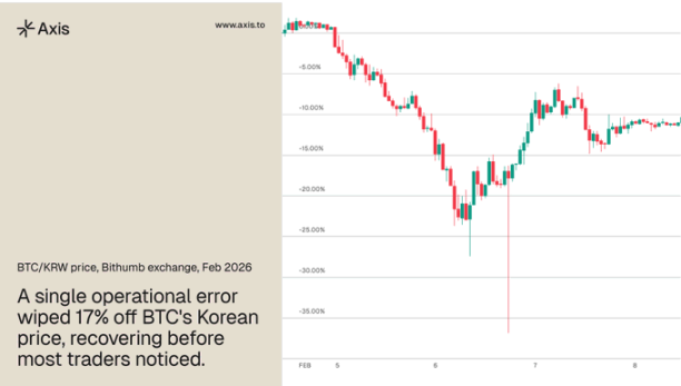 公告发布后,资本迅速向 Upbit 迁移,进一步加深了集中度。2026 年 2 月,Bithumb 发生操作错误,向用户账户误记入 62 万枚比特币,导致 BTC/KRW 交易对出现 17% 的闪崩,随后价格才得以恢复。这一事件生动说明了当价格发现依赖于单一压力下运行的交易场所时,会是怎样的情形。