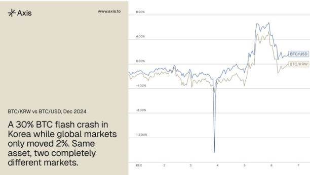 最清晰的记录出现在 2024 年 12 月 3 日,当时韩国总统尹锡悦宣布戒严。韩国比特币价格日内下跌约 30%,而全球价格仅下跌约 2%,二者相差 28 个百分点,完全由国内政治冲击引发。此次抛售总额约为 333 亿美元,韩国市场一度录得全球最高交易量,这一事件是韩国市场错位典型展开方式的经典案例。